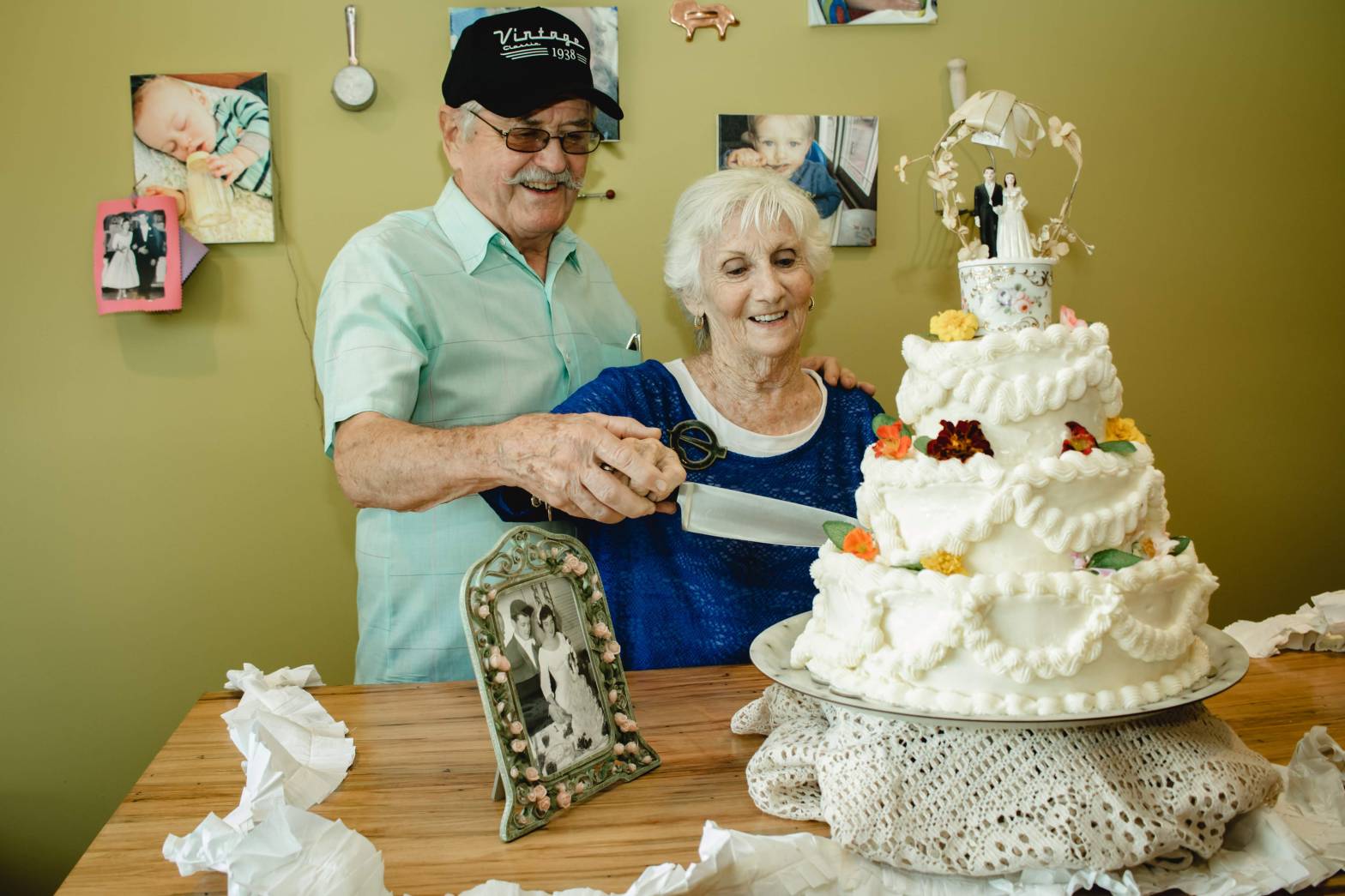 (Why this picture of my grandparents? One of those layers is this recipe! Really! My grandfather LOVES bananas, chocolate, and peanut butter, preferably combined. For their combined 80th Birthday/59th Anniversary extravaganza a few years ago…yes, those three things all fall on the same day…I recreated their original wedding cake, seen in the picture, with their favorite flavors: lemon poppyseed, banana/chocolate chip/peanut butter swirl, and dark chocolate. That is their actual original wedding topper on top! It was a hot day so it had started to fall a bit by this point, but it was delicious!)